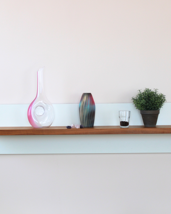 Die Basis bildet eine minimalistische Vase, die von Nookanie entworfen und hergestellt wird. Durch die farbige Veredelung entsteht aus jeder Form ein eigenständiges Objekt mit klarer Präsenz und ruhiger Wirkung im Raum.